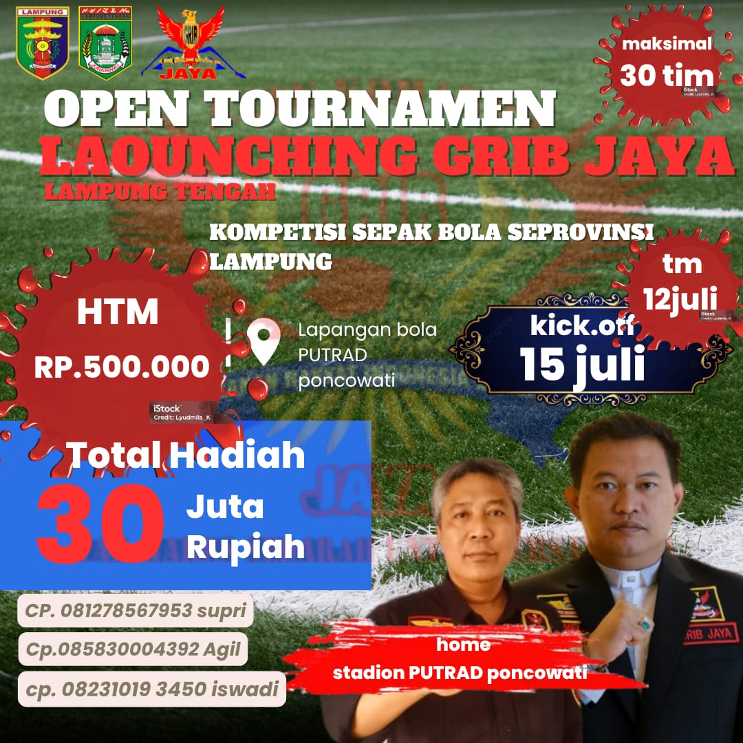 Poncowati, Lampung Tengah, Kamis, 24 juli 2025 (Grib Jaya) – Grib jaya Open Cup Football 2025 yang di selenggarakan di lapangan Poncowati dihadiri oleh Anggota DPD RI BPK Bustami Zainuddin,,kedatangan beliau ini adalah bentuk dukungan pemerintah dalam kegiatan kegiatan positif yang di lakukan oleh masyarakat,dalam hal ini adalah Ormas Grib Jaya sebagai penyelanggara kegiatan Grib Jaya cup open tournament tersebut.